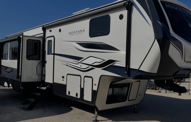 Beautiful, barely used fifth wheel Montana High Country, full size refrigerator, 2 AC units, can sleep 8 total. Large bathroom, King east/west slide master bedroom, faux fireplace heater, 50 inch flat screen tv in living room, hookups for washer/dryer combo machine, and central vacuum system. Outdoor kitchen component with stove and mini fridge for those that like to cook and hang out outdoors.