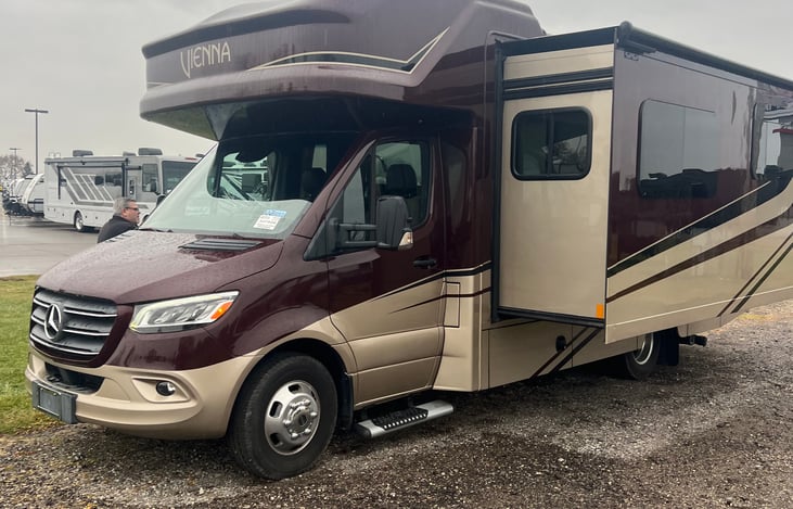 Beautiful Diesel Sprinter Renegade Vienna with a murphy queen bed and over the cab bunk that sleeps three comfortably. This RV has all the comfort and safety features one expects in the updated Mercedes Chassis. It also has in Comfortable Lazy Boy type seats with indoor and outdoor TVs, automatic leveling system, ample storage, tankless water system and awning.
