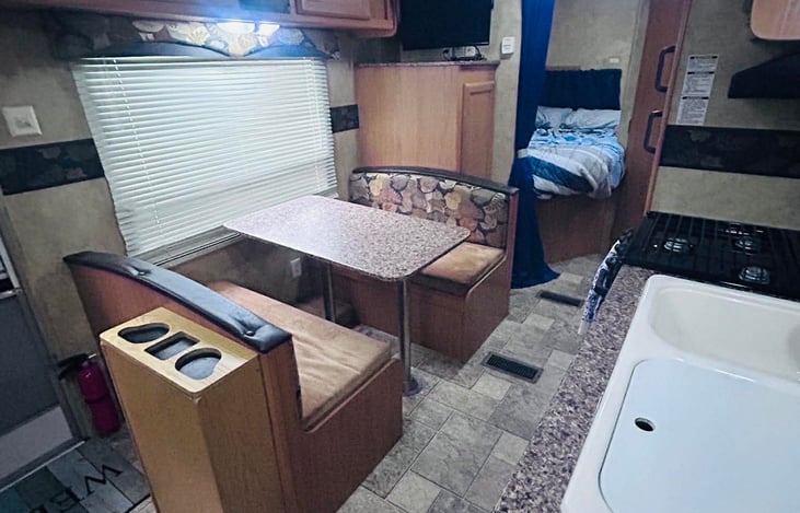 This Camper has plenty of space for your family but still is compact enough at 23ft Long to fit into almost any Campsite! It can sleep up to 7 with a Pull out Couch bed, the Dinette which converts to bed, a Above the Bed Bunk which folds down and the Full Size Bed in the back which includes a memory foam mattress topper to make it extra comfortable.