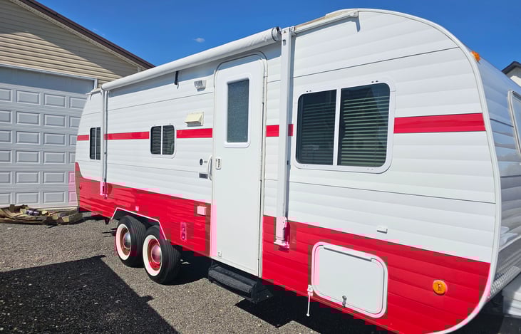 This Travel Trailer is an eye turner! It has that "Retro" look but has all the updated amenities you need inside! We just installed a new, electric awning on it so now, it is easier to use. With dual axles, this little gem can hold a lot more weight.