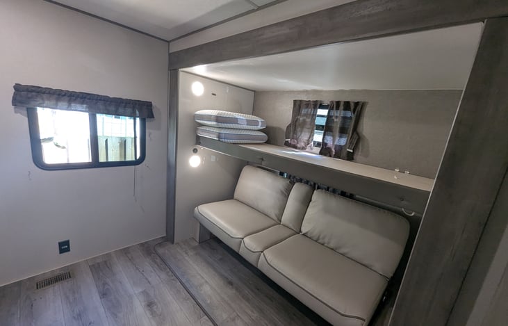 The premier bunk house floorplan on the market! Our versatile bunk room sleeps 5+ comfortably and includes an entertainment center, storage, and our unique COA cube futon. We designed the ultimate master suite with an enormous closet featuring a full-length hanging rod and shelves, as well as an additional utility closet with everything you need to add a washer/dryer.