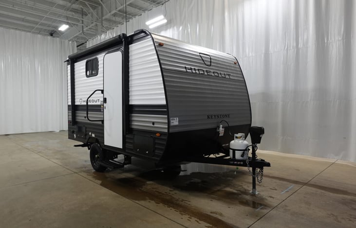 This lightweight travel trailer is perfect for four happy campers. You'll enjoy the front full-size bed, while your guests or little ones take the double-size bunks. There is also a shelf above the bed to keep your things organized. A private bath includes a shower with a toilet so you can freshen up each day without having to leave your camper.