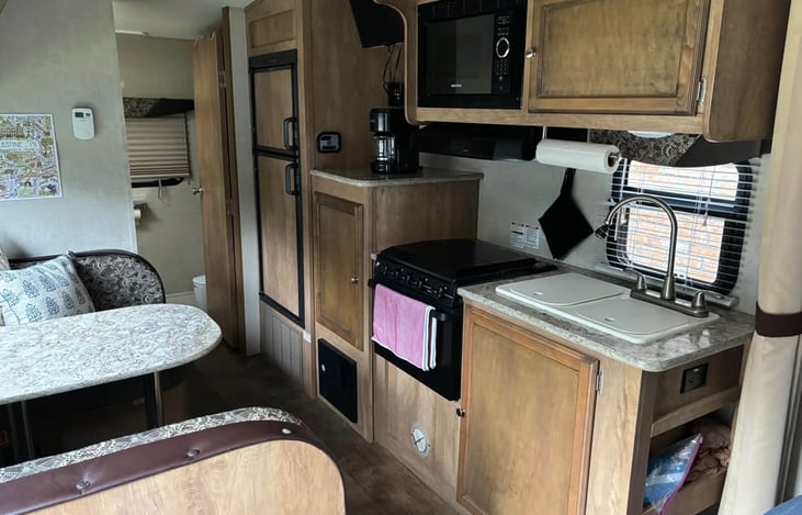 Perfect for weekend trips, family adventures, or couples escapes, this travel trailer offers a comfortable place to relax after a day outdoors.