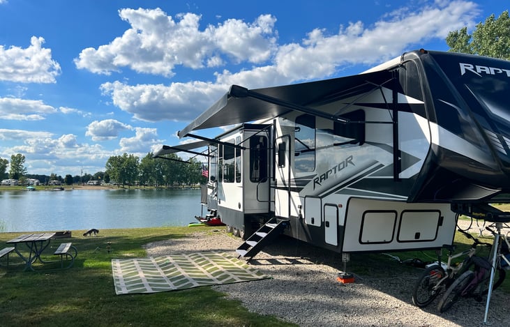 Enjoy your next trip in our spacious and fully loaded Raptor 415. Perfect for families or adventure trips, this luxury toy hauler features a private king bedroom, loft, and convertible sleeping areas. Large rear garage doubles as extra living space and includes a patio deck—great for relaxing outdoors.