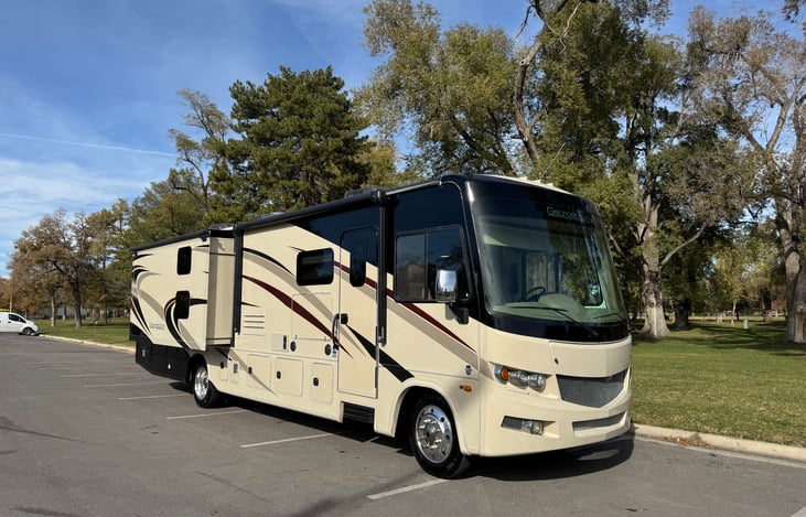 Family friendly Class A RV that sleeps 6 to 9 and seats 7. 2 full bathrooms, washer-dryer, a bunkhouse, overhead bunk, and pullout hide-a-bed. This is perfect for families. Pet friendly. Gas powered with a generator. Plenty of extra storage. LP gas flame grill and fire pit are available. Newly updated infotainment 10.5 in screen head unit with Android Auto and Apple CarPlay.