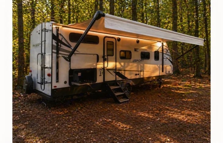 "Smoky Pass" Keystone RV Passport is a lightweight travel trailer designed for families, featuring a bunkhouse layout and a single slide-out to maximize living space. Known for its "Grand Touring" features, it includes premium upgrades like a vaulted ceiling, power stabilizing jacks, and an outdoor kitchen.